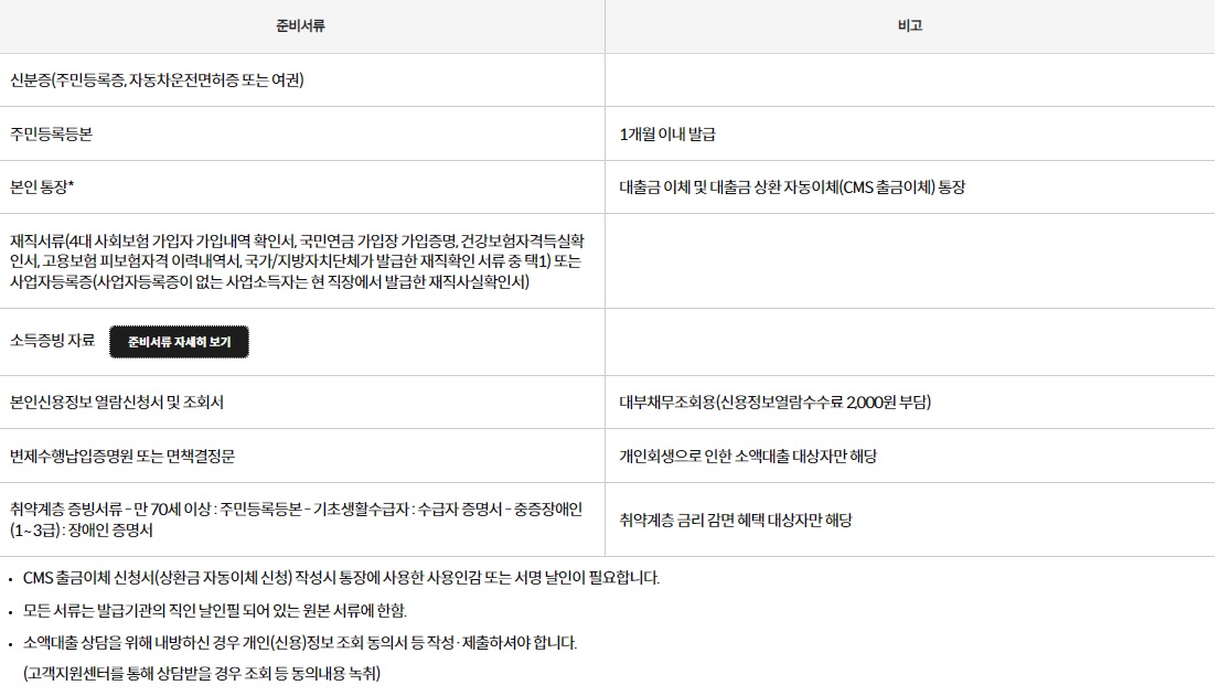 국민행복기금 소액대출의 신청서류는 다음과 같습니다.