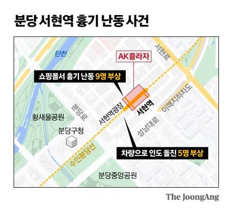 경기 분당구 서현역 인근에서 ‘묻지마 흉기 난동’ 사건을 벌인 피의자 최모(23)씨는 짧은 시간 유유히 걸어 다니며 일면식도 없는 피해자들을 공격한 것으로 파악됐다.
