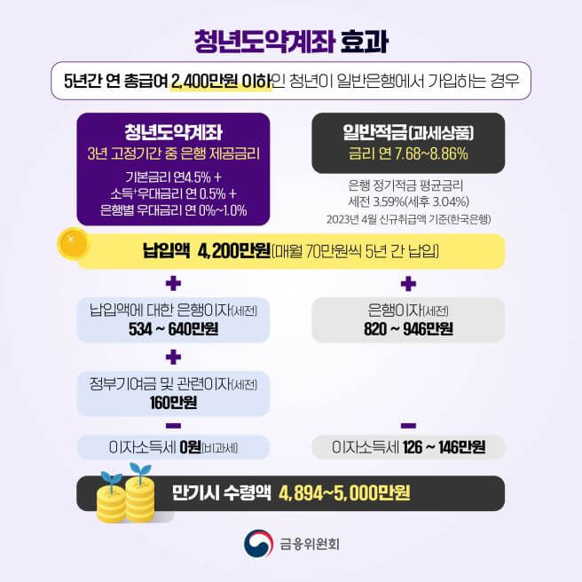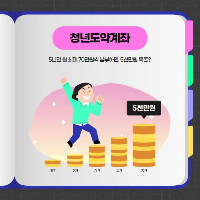 청년도약계좌는 정부가 지원하는 금융 제도로, 5년간 70만원씩 적금을 붓거나 주식 등에 투자할 경우 정부 지원금을 포함하고 비과세 혜택을 포함하여 최대 5,000만 원이라는 큰 목독을 마련할 수 있도록 지원해 주는 제도입니다.