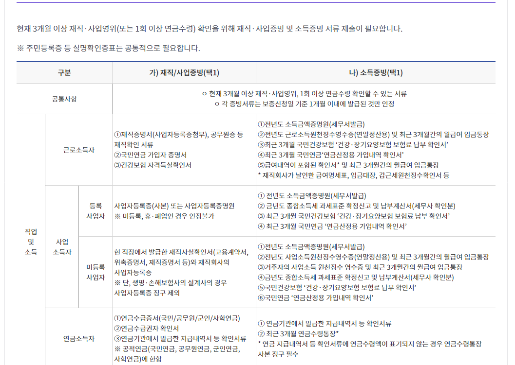 현재 3개월 이상 재직·사업영위(또는 1회 이상 연금수령) 확인을 위해 재직·사업증빙 및 소득증빙 서류 제출이 필요합니다.
